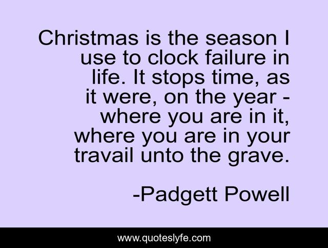 This page presents the quote "Christmas is the season I use to clock failure in life. It stops time, as it were, on the year - where you are in it, where you are in your travail unto the grave.". Author of this quote is Padgett Powell. This quote is about failure, life, time,.