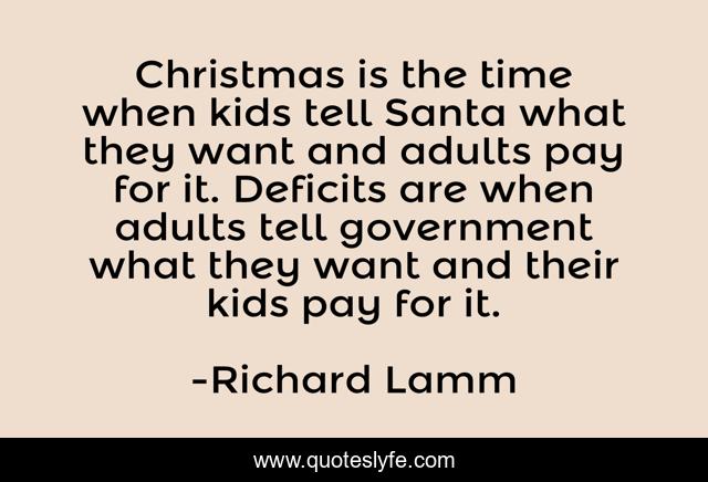 This page presents the quote "Christmas is the time when kids tell Santa what they want and adults pay for it. Deficits are when adults tell government what they want and their kids pay for it.". Author of this quote is Richard Lamm. This quote is about time, government,.