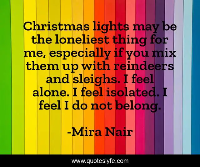 This page presents the quote "Christmas lights may be the loneliest thing for me, especially if you mix them up with reindeers and sleighs. I feel alone. I feel isolated. I feel I do not belong.". Author of this quote is Mira Nair. This quote is about alone, me,.