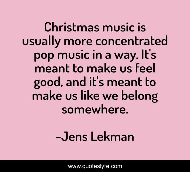 This page presents the quote "Christmas music is usually more concentrated pop music in a way. It's meant to make us feel good, and it's meant to make us like we belong somewhere.". Author of this quote is Jens Lekman. This quote is about feel good, good, music,.