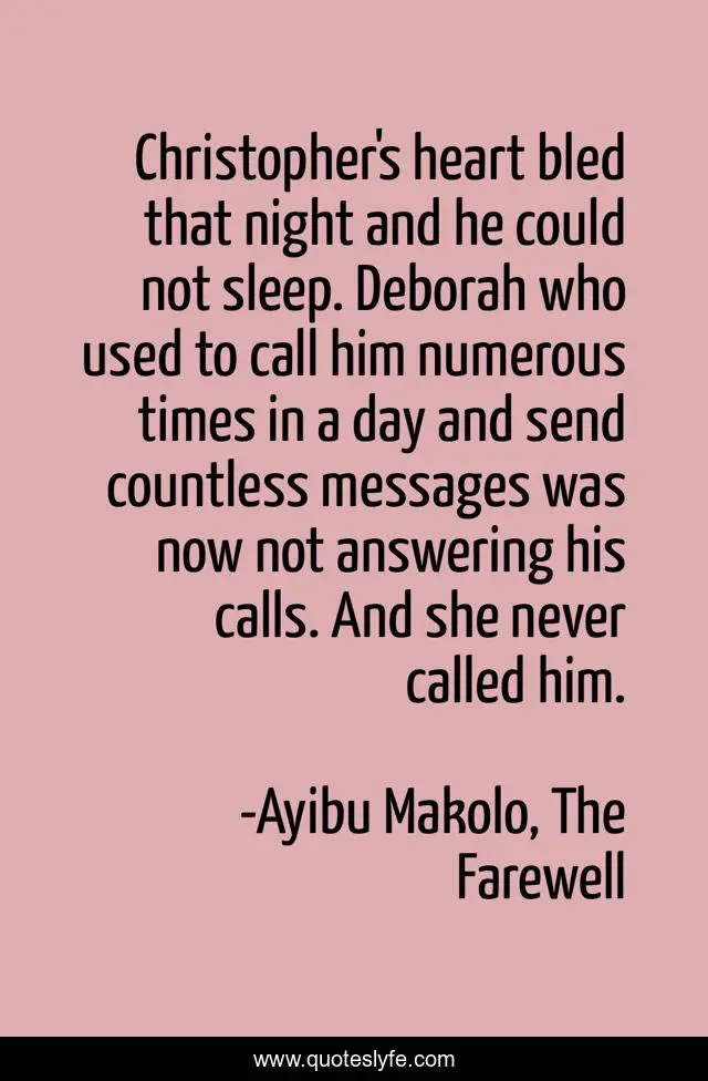 This page presents the quote "Christopher's heart bled that night and he could not sleep. Deborah who used to call him numerous times in a day and send countless messages was now not answering his calls. And she never called him.". Author of this quote is Ayibu Makolo, The Farewell. This quote is about literature, african, fiction,.