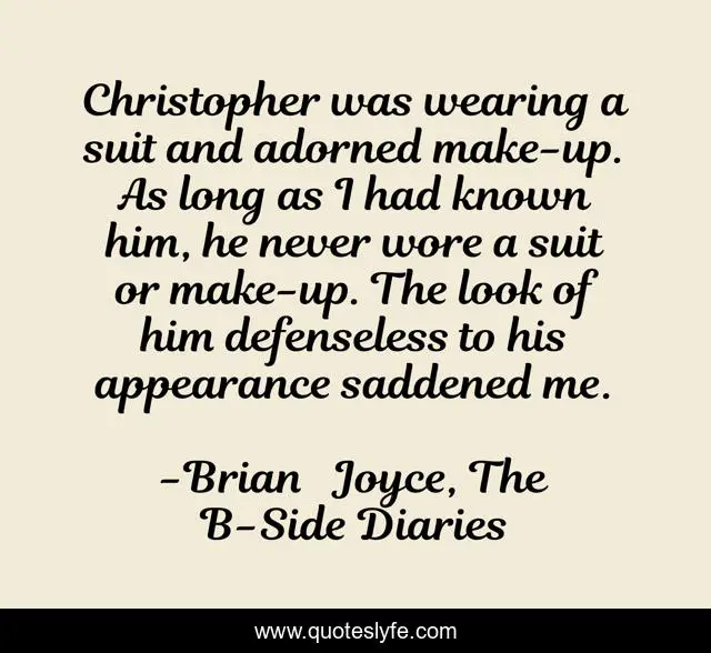 This page presents the quote "Christopher was wearing a suit and adorned make-up. As long as I had known him, he never wore a suit or make-up. The look of him defenseless to his appearance saddened me.". Author of this quote is Brian Joyce, The B-Side Diaries. This quote is about contemporary-fiction, young-adult-fiction, indie-music, death-and-dying, punk-rock,.