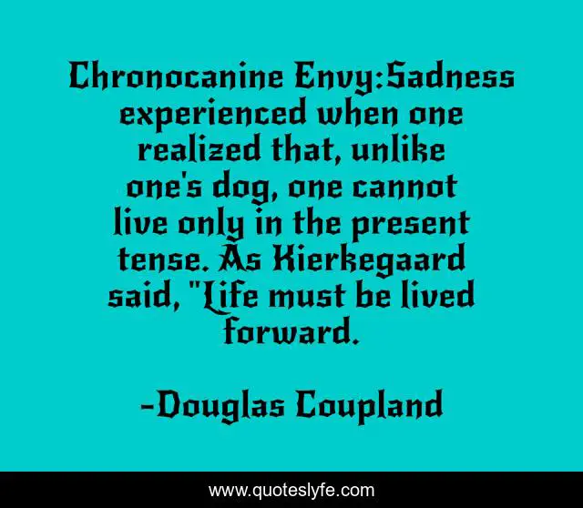This page presents the quote "Chronocanine Envy:Sadness experienced when one realized that, unlike one's dog, one cannot live only in the present tense. As Kierkegaard said, "Life must be lived forward.". Author of this quote is Douglas Coupland. This quote is about future, present-moment, time,.