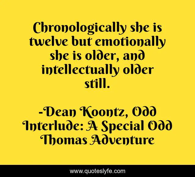 This page presents the quote "Chronologically she is twelve but emotionally she is older, and intellectually older still.". Author of this quote is Dean Koontz, Odd Interlude: A Special Odd Thomas Adventure. This quote is about maturity, age, maturitygence, odd-thomas, jolie-ann-harmony,.