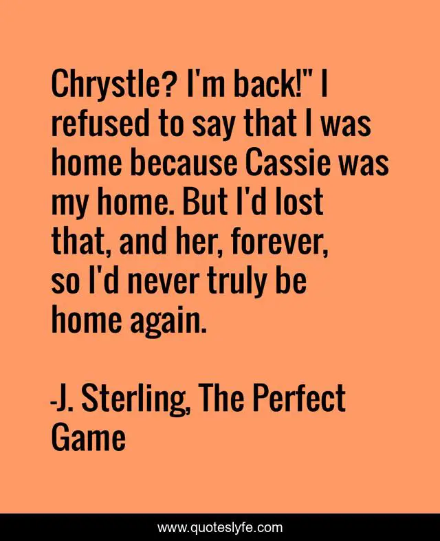 This page presents the quote "Chrystle? I'm back!" I refused to say that I was home because Cassie was my home. But I'd lost that, and her, forever, so I'd never truly be home again.". Author of this quote is J. Sterling, The Perfect Game. This quote is about angst, love, soulmates, affection,.