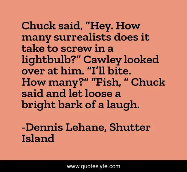 This page presents the quote "Chuck said, “Hey. How many surrealists does it take to screw in a lightbulb?” Cawley looked over at him. “I’ll bite. How many?” “Fish, ” Chuck said and let loose a bright bark of a laugh.". Author of this quote is Dennis Lehane, Shutter Island. .