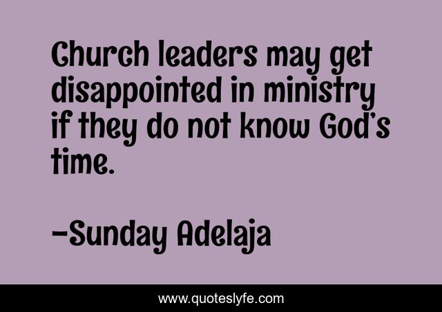 This page presents the quote "Church leaders may get disappointed in ministry if they do not know God’s time.". Author of this quote is Sunday Adelaja. This quote is about church, disappointed, leaders, ministry,.