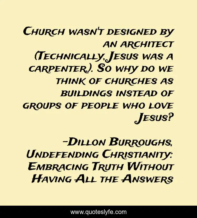 "Dillon Burroughs, Undefending Christianity: Embracing Truth Without Having All the Answers Quotes." Quoteslyfe.com, 2025. Sat. 06 Dec. 2025. <https://www.quoteslyfe.com/quote/Church-wasn-t-designed-by-an-architect-193802>.