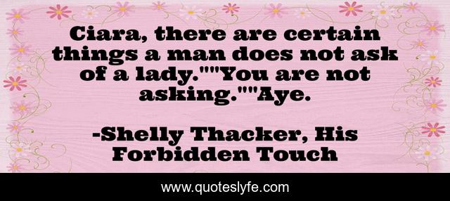 This page presents the quote "Ciara, there are certain things a man does not ask of a lady.""You are not asking.""Aye.". Author of this quote is Shelly Thacker, His Forbidden Touch. This quote is about romance, audible, historical-romance,.