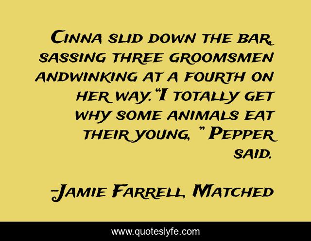 This page presents the quote "Cinna slid down the bar, sassing three groomsmen andwinking at a fourth on her way.“I totally get why some animals eat their young, ” Pepper said.". Author of this quote is Jamie Farrell, Matched. This quote is about contemporary-romance, adult-ice-cream-flavors, country-rock-star-romance, fun-romance, bliss, lawyer,.
