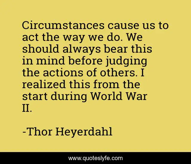 This page presents the quote "Circumstances cause us to act the way we do. We should always bear this in mind before judging the actions of others. I realized this from the start during World War II.". Author of this quote is Thor Heyerdahl. This quote is about world, mind, start,.