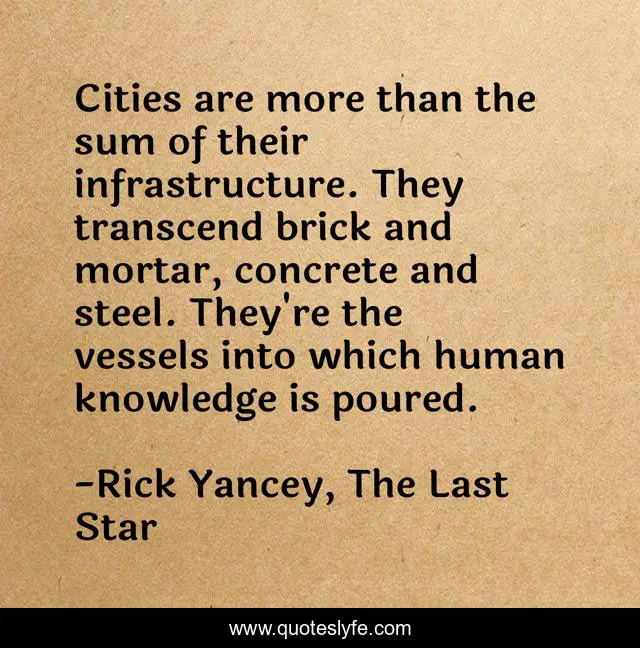 This page presents the quote "Cities are more than the sum of their infrastructure. They transcend brick and mortar, concrete and steel. They're the vessels into which human knowledge is poured.". Author of this quote is Rick Yancey, The Last Star. This quote is about apocalyptic, building, infrastructure, knowledge, city, human-nature, human-knowledge, science-fiction, civilization,.
