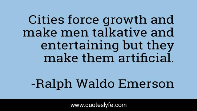 This page presents the quote "Cities force growth and make men talkative and entertaining but they make them artificial.". Author of this quote is Ralph Waldo Emerson. .