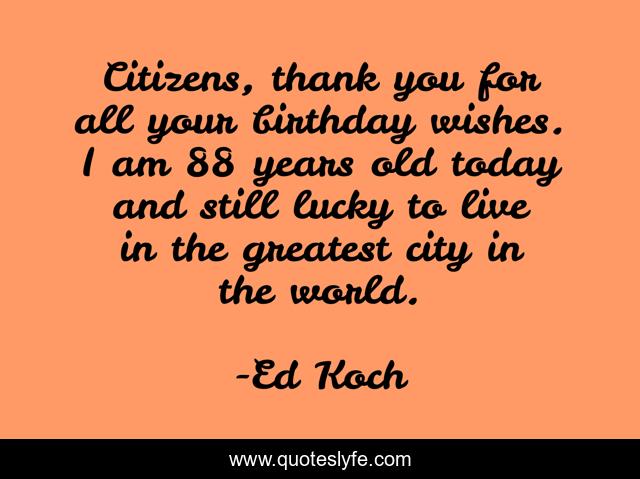 This page presents the quote "Citizens, thank you for all your birthday wishes. I am 88 years old today and still lucky to live in the greatest city in the world.". Author of this quote is Ed Koch. This quote is about world, today,.