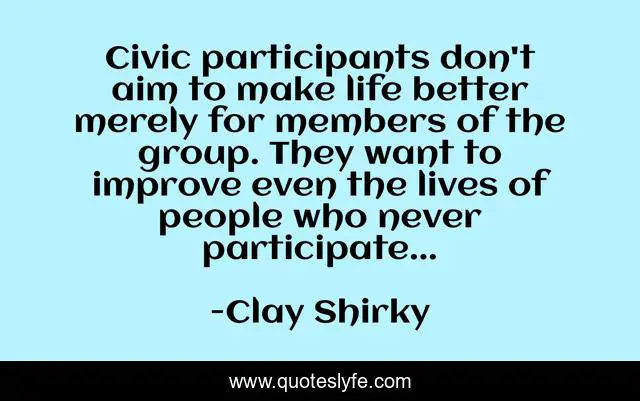 "Clay Shirky Quotes." Quoteslyfe.com, 2025. Fri. 05 Dec. 2025. <https://www.quoteslyfe.com/quote/Civic-participants-don-t-aim-to-make-196653>.