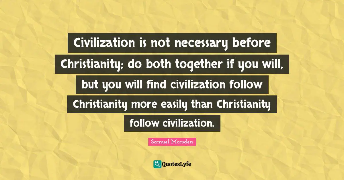 This page presents the quote "Civilization is not necessary before Christianity; do both together if you will, but you will find civilization follow Christianity more easily than Christianity follow civilization.". Author of this quote is Samuel Marsden. This quote is about together, christianity, civilization, missionary,.