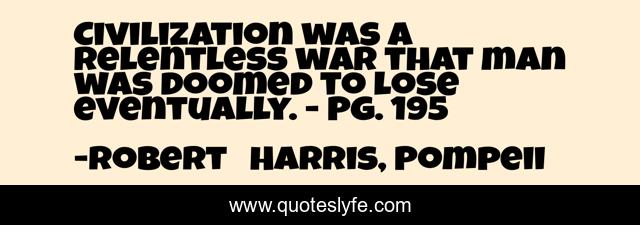 This page presents the quote "Civilization was a relentless war that man was doomed to lose eventually. - Pg. 195". Author of this quote is Robert Harris, Pompeii. This quote is about civilization, man-vs-nature,.