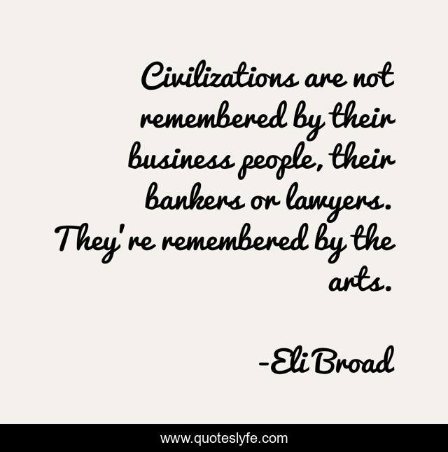 This page presents the quote "Civilizations are not remembered by their business people, their bankers or lawyers. They're remembered by the arts.". Author of this quote is Eli Broad. This quote is about arts, lawyers, people,.