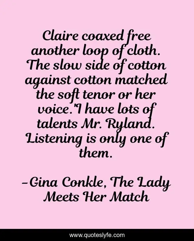 This page presents the quote "Claire coaxed free another loop of cloth. The slow side of cotton against cotton matched the soft tenor or her voice.'I have lots of talents Mr. Ryland. Listening is only one of them.". Author of this quote is Gina Conkle, The Lady Meets Her Match. .