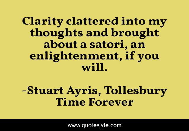 This page presents the quote "Clarity clattered into my thoughts and brought about a satori, an enlightenment, if you will.". Author of this quote is Stuart Ayris, Tollesbury Time Forever. This quote is about inspirational-attitude, zen,.