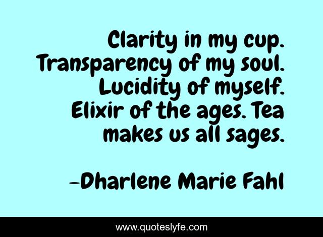 This page presents the quote "Clarity in my cup. Transparency of my soul. Lucidity of myself. Elixir of the ages. Tea makes us all sages.". Author of this quote is Dharlene Marie Fahl. This quote is about clarity-of-thought, tea, tea-sage, soul, elixir,.