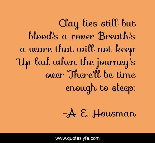 This page presents the quote "Clay lies still but blood's a rover Breath's a ware that will not keep Up lad when the journey's over There'll be time enough to sleep.". Author of this quote is A. E. Housman. .