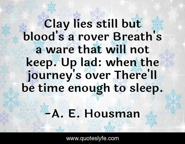 This page presents the quote "Clay lies still but blood's a rover Breath's a ware that will not keep. Up lad: when the journey's over There'll be time enough to sleep.". Author of this quote is A. E. Housman. .