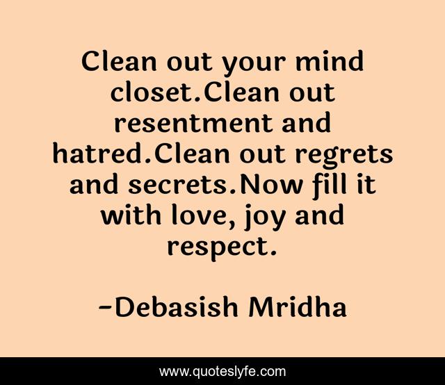 This page presents the quote "Clean out your mind closet.Clean out resentment and hatred.Clean out regrets and secrets.Now fill it with love, joy and respect.". Author of this quote is Debasish Mridha. This quote is about life, love, knowledge, inspirational, intelligence, philosophy, wisdom, quotes, affection,.