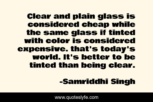 This page presents the quote "Clear and plain glass is considered cheap while the same glass if tinted with color is considered expensive. that's today's world. It's better to be tinted than being clear.". Author of this quote is Samriddhi Singh. This quote is about life-lesson, life,.