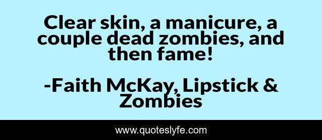 This page presents the quote "Clear skin, a manicure, a couple dead zombies, and then fame!". Author of this quote is Faith McKay, Lipstick & Zombies. This quote is about horror, humor, zombies, ambition,.
