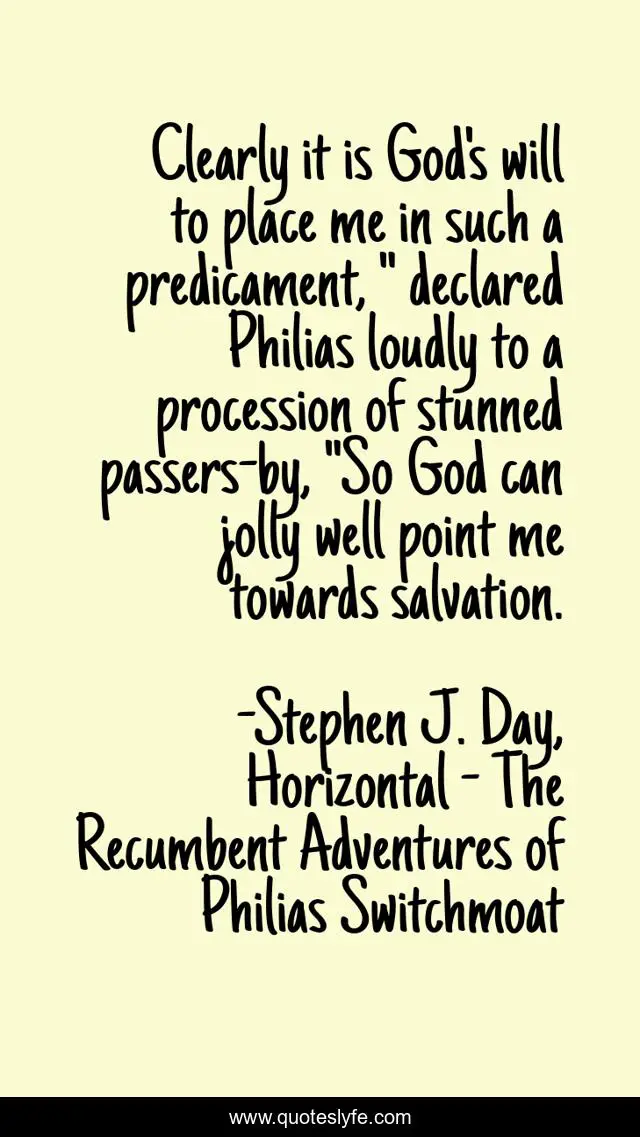 This page presents the quote "Clearly it is God's will to place me in such a predicament, " declared Philias loudly to a procession of stunned passers-by, "So God can jolly well point me towards salvation.". Author of this quote is Stephen J. Day, Horizontal - The Recumbent Adventures of Philias Switchmoat. This quote is about god, declaration, salvation, predicament,.