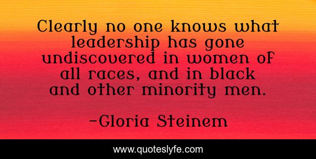 This page presents the quote "Clearly no one knows what leadership has gone undiscovered in women of all races, and in black and other minority men.". Author of this quote is Gloria Steinem. This quote is about men, black, women,.