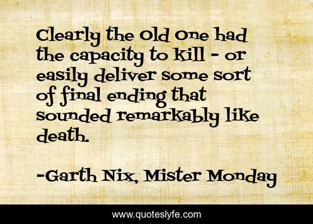 This page presents the quote "Clearly the Old One had the capacity to kill - or easily deliver some sort of final ending that sounded remarkably like death.". Author of this quote is Garth Nix, Mister Monday. This quote is about old-one, dead,.