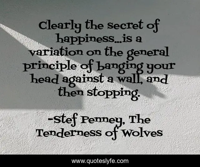This page presents the quote "Clearly the secret of happiness...is a variation on the general principle of banging your head against a wall, and then stopping.". Author of this quote is Stef Penney, The Tenderness of Wolves. .