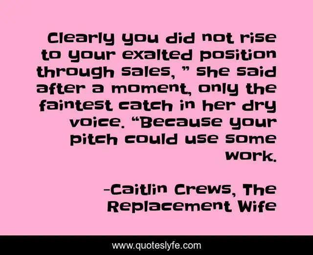 This page presents the quote "Clearly you did not rise to your exalted position through sales, ” she said after a moment, only the faintest catch in her dry voice. “Because your pitch could use some work.". Author of this quote is Caitlin Crews, The Replacement Wife. This quote is about convince, persuade, order, sales,.