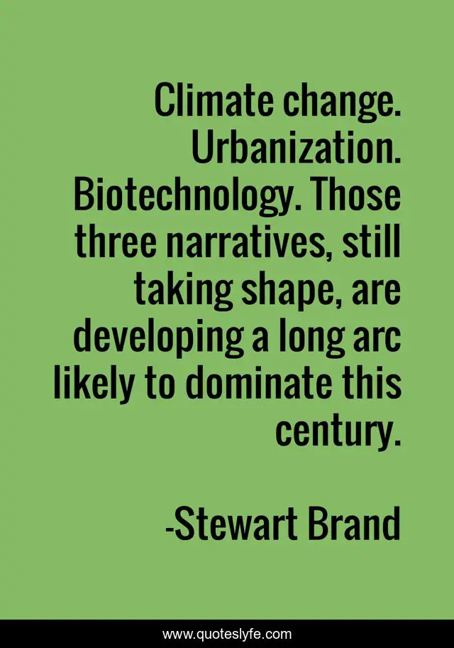 This page presents the quote "Climate change. Urbanization. Biotechnology. Those three narratives, still taking shape, are developing a long arc likely to dominate this century.". Author of this quote is Stewart Brand. .