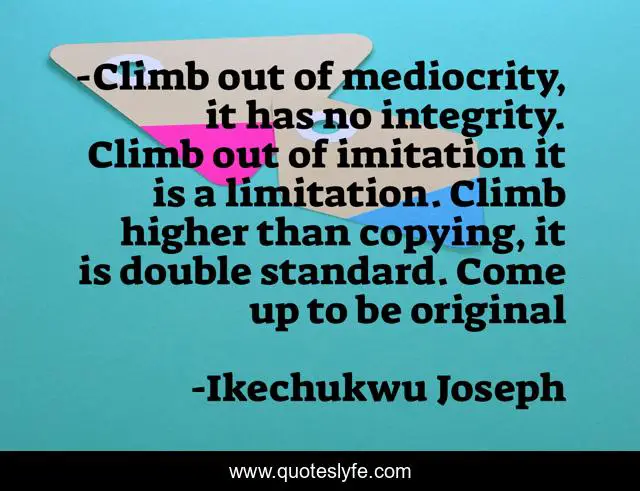 This page presents the quote "-Climb out of mediocrity, it has no integrity. Climb out of imitation it is a limitation. Climb higher than copying, it is double standard. Come up to be original". Author of this quote is Ikechukwu Joseph. This quote is about quotes, christian-living,.