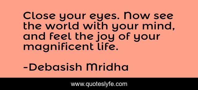 This page presents the quote "Close your eyes. Now see the world with your mind, and feel the joy of your magnificent life.". Author of this quote is Debasish Mridha. This quote is about see-the-world-with-your-mind, joy, philosophy, debasish-mridha, joy-of-life, quotes, inspirational, enthusiasm, debasish-mridha-m-d,.