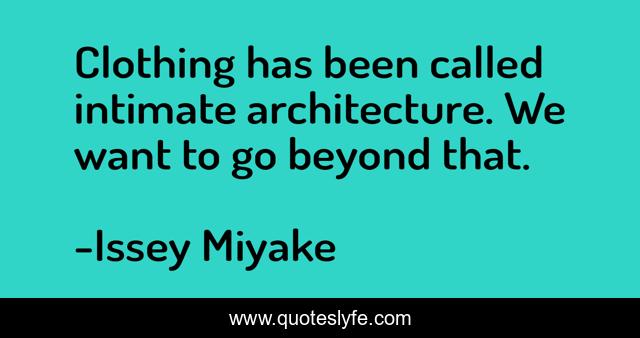 This page presents the quote "Clothing has been called intimate architecture. We want to go beyond that.". Author of this quote is Issey Miyake. This quote is about beyond, clothing,.