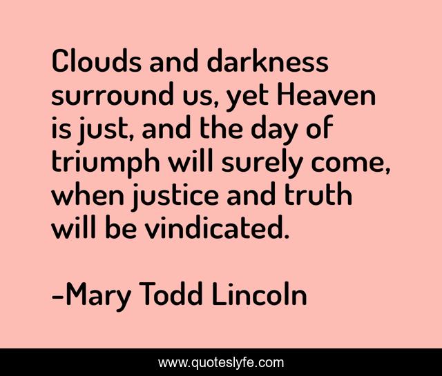This page presents the quote "Clouds and darkness surround us, yet Heaven is just, and the day of triumph will surely come, when justice and truth will be vindicated.". Author of this quote is Mary Todd Lincoln. This quote is about justice, day, darkness,.