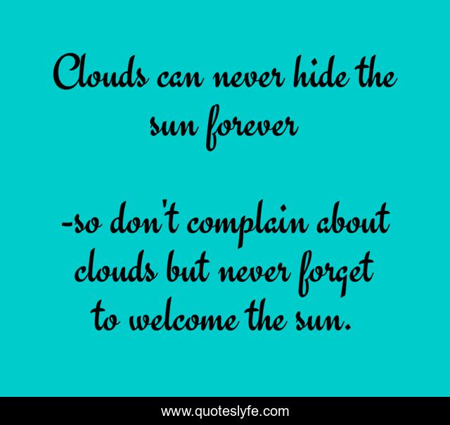 This page presents the quote "Clouds can never hide the sun forever". Author of this quote is so don't complain about clouds but never forget to welcome the sun.. .