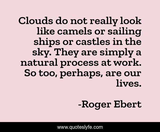 This page presents the quote "Clouds do not really look like camels or sailing ships or castles in the sky. They are simply a natural process at work. So too, perhaps, are our lives.". Author of this quote is Roger Ebert. This quote is about sky, clouds, sailing,.