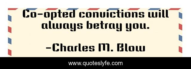This page presents the quote "Co-opted convictions will always betray you.". Author of this quote is Charles M. Blow. This quote is about betrayal, co-opting, convictions, beliefs,.