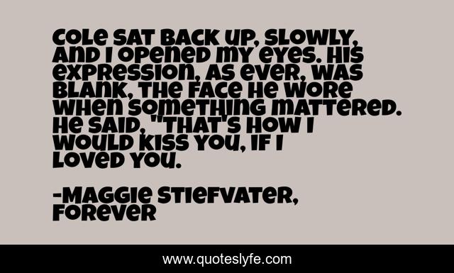 This page presents the quote "Cole sat back up, slowly, and I opened my eyes. His expression, as ever, was blank, the face he wore when something mattered. He said, "That's how I would kiss you, if I loved you.". Author of this quote is Maggie Stiefvater, Forever. This quote is about isabel, forever, cole, kiss,.