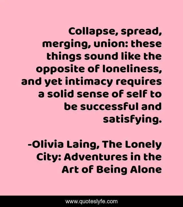 This page presents the quote "Collapse, spread, merging, union: these things sound like the opposite of loneliness, and yet intimacy requires a solid sense of self to be successful and satisfying.". Author of this quote is Olivia Laing, The Lonely City: Adventures in the Art of Being Alone. This quote is about intimacy, loneliness,.
