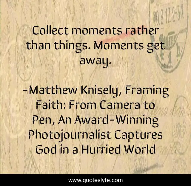 "Matthew Knisely, Framing Faith: From Camera to Pen, An Award-Winning Photojournalist Captures God in a Hurried World Quotes." Quoteslyfe.com, 2025. Fri. 05 Dec. 2025. <https://www.quoteslyfe.com/quote/Collect-moments-rather-than-things-Moments-get-238609>.