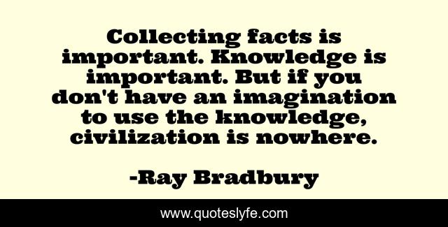 This page presents the quote "Collecting facts is important. Knowledge is important. But if you don't have an imagination to use the knowledge, civilization is nowhere.". Author of this quote is Ray Bradbury. This quote is about facts, imagination,.