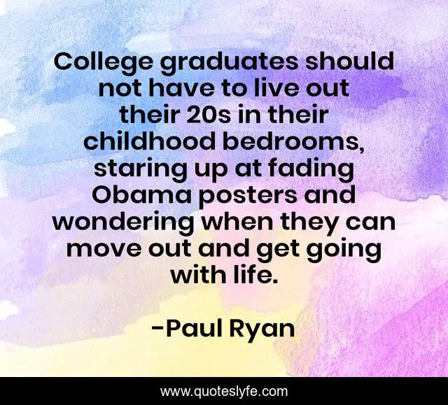 This page presents the quote "College graduates should not have to live out their 20s in their childhood bedrooms, staring up at fading Obama posters and wondering when they can move out and get going with life.". Author of this quote is Paul Ryan. This quote is about life, college, childhood,.