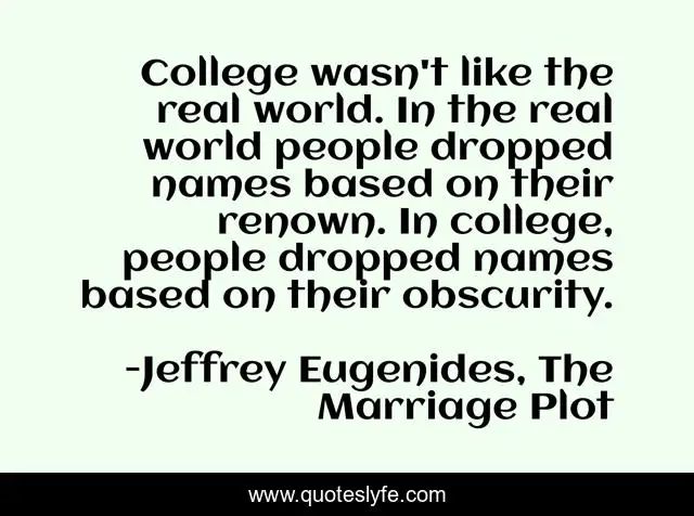 "Jeffrey Eugenides, The Marriage Plot Quotes." Quoteslyfe.com, 2025. Sun. 07 Dec. 2025. <https://www.quoteslyfe.com/quote/College-wasn-t-like-the-real-world-205575>.