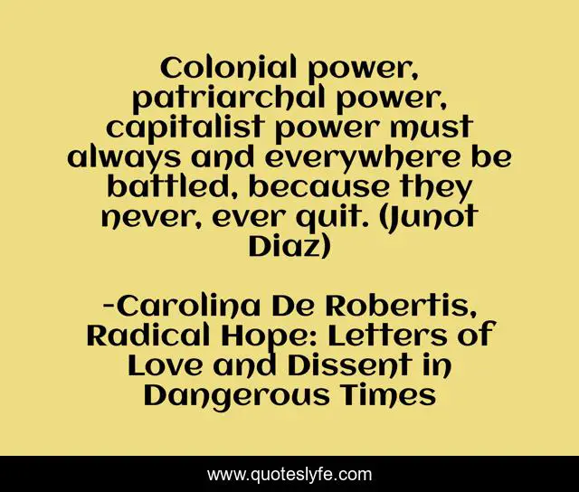 This page presents the quote "Colonial power, patriarchal power, capitalist power must always and everywhere be battled, because they never, ever quit. (Junot Diaz)". Author of this quote is Carolina De Robertis, Radical Hope: Letters of Love and Dissent in Dangerous Times. This quote is about colonialism, capitalism, hope, power, patriarchy,.